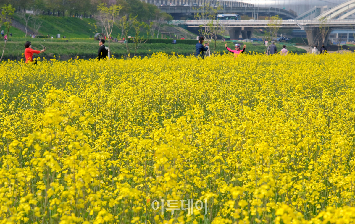 전국이 맑은 가운데 서울 낮 최고기온이 22도를 기록하는 등 따뜻한 봄 날씨를 보인 11일 안양천변에 만개한 유채꽃이 시민들의 시선을 끌고 있다.