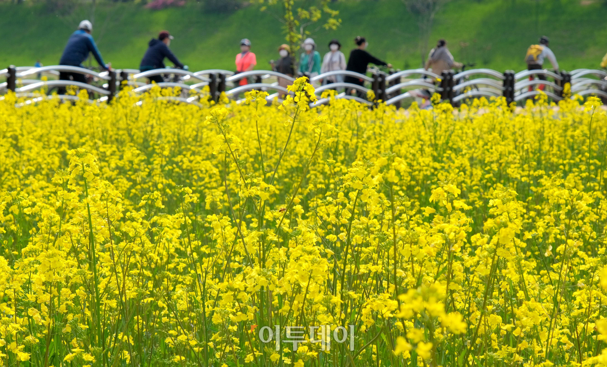 전국이 맑은 가운데 서울 낮 최고기온이 22도를 기록하는 등 따뜻한 봄 날씨를 보인 11일 안양천변에 만개한 유채꽃이 시민들의 시선을 끌고 있다.