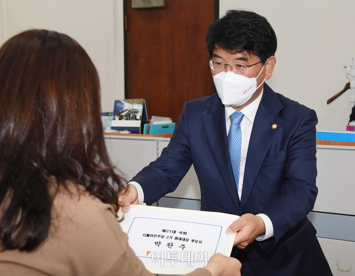 박완주 더불어민주당 의원이 12일 오전 서울 여의도 국회에서 원내대표 경선 후보 등록을 하고 있다.