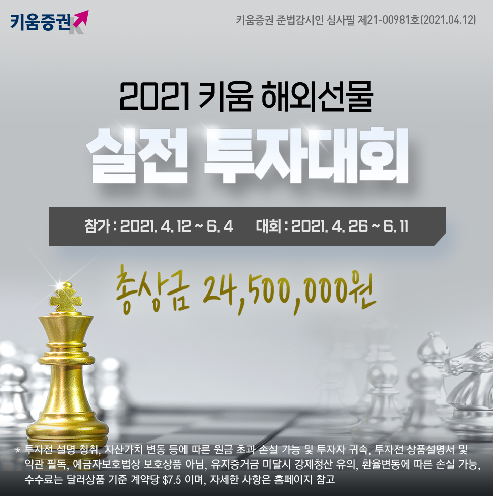 키움증권은 총상금 2450만 원 규모의 ‘해외선물 실전투자대회’를 진행한다고 12일 밝혔다.