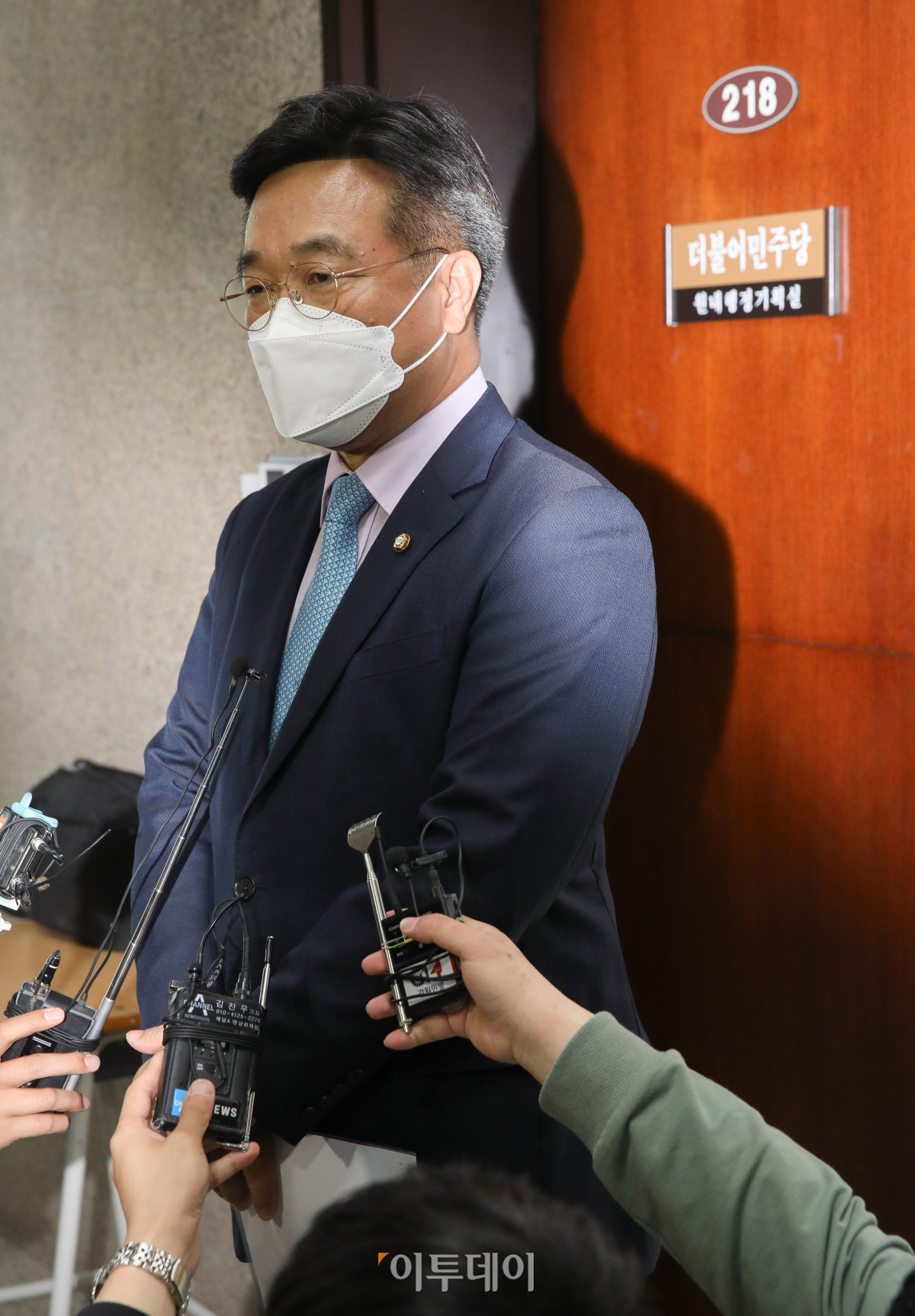 윤호중 더불어민주당 의원이 12일 오전 서울 여의도 국회에서 원내대표 경선 후보자 등록을 마친 뒤 취재진의 질문에 답변하고 있다.