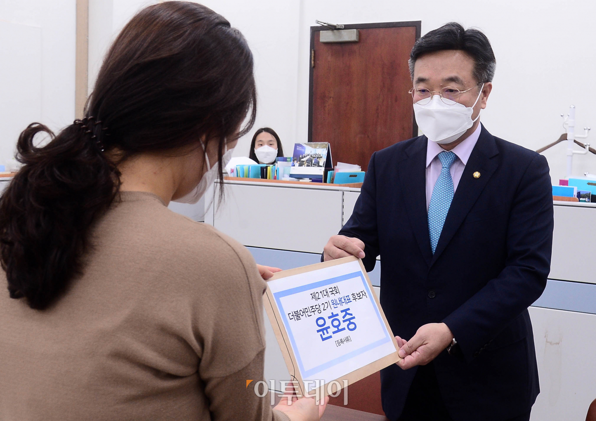 윤호중 더불어민주당 의원이 12일 서울 여의도 국회에서 차기 원내대표 출마를 위해 후보 등록을 하고 있다.