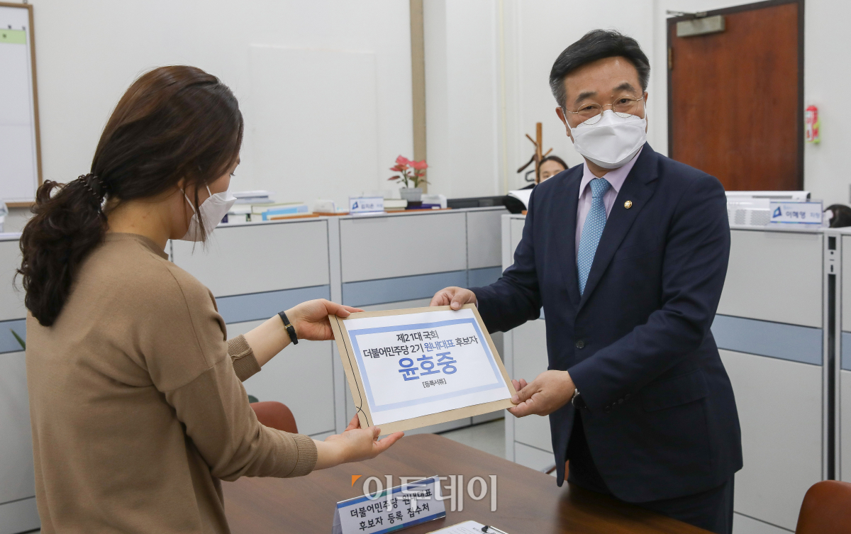 윤호중 더불어민주당 의원이 12일 오전 서울 여의도 국회에서 원내대표 경선 후보자 등록을 하고 있다.