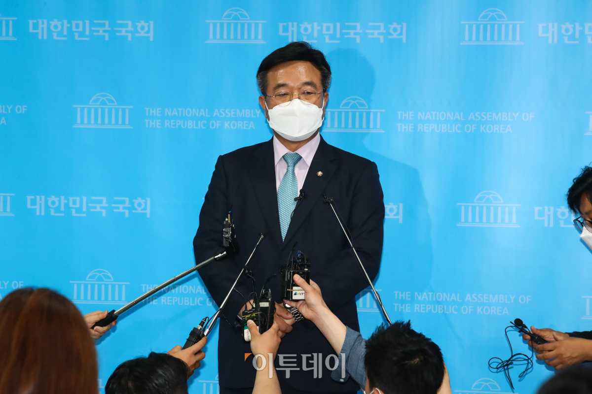 더불어민주당 원내대표 후보 등록을 마친 윤호중 의원이 12일 국회 소통관에서 기자회견을 마친 뒤 취재진의 질문에 답변하고 있다.