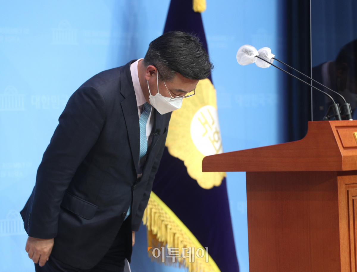 윤호중 더불어민주당 의원이 12일 오전 서울 여의도 국회 소통관에서 열린 원내대표 출마 선언 기자회견에서 인사하고 있다.