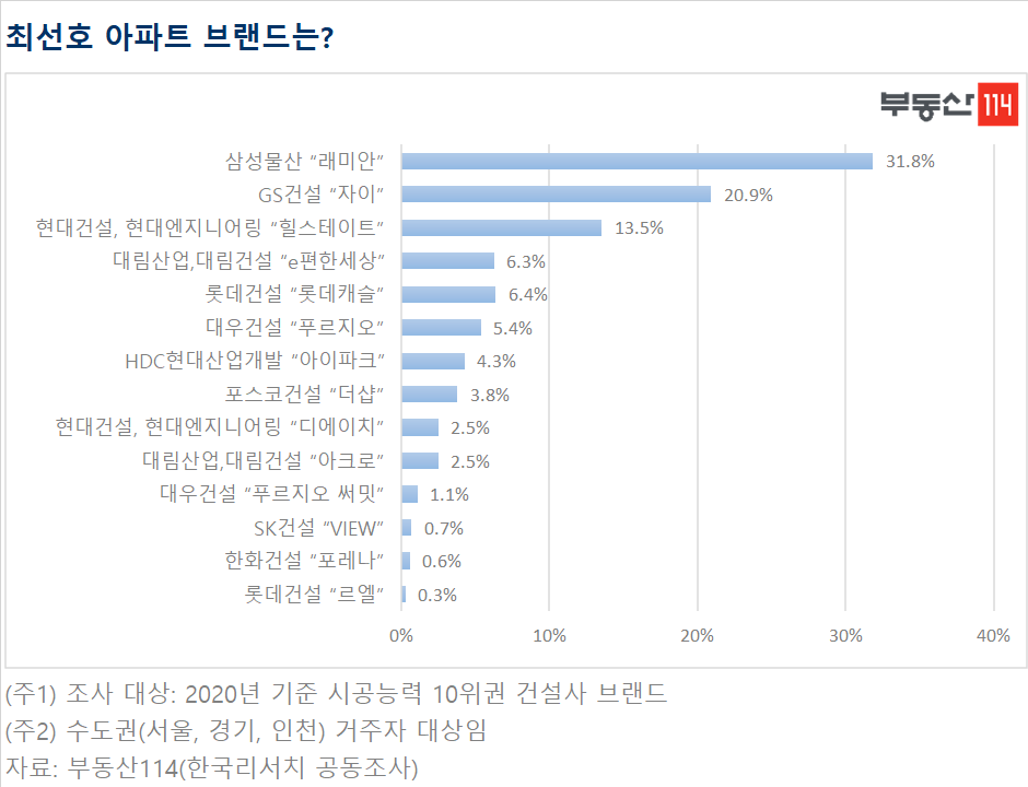 부동산 정보업체 부동산114와 여론조사 업체 한국리서치에 따르면 래미안은 최선호 아파트 브랜드 조사에서 1위를 차지했다. 응답자 중 31.8%가 최선호 브랜드로 래미안을 꼽았다. GS건설 '자이'(20.9%)와 현대건설ㆍ현대엔지니어링 '힐스테이트'(13.5%), 롯데건설 '롯데캐슬'(6.4%), DL이앤씨ㆍDL건설 'e편한세상'(6.3%) 등이 뒤를 이었다.