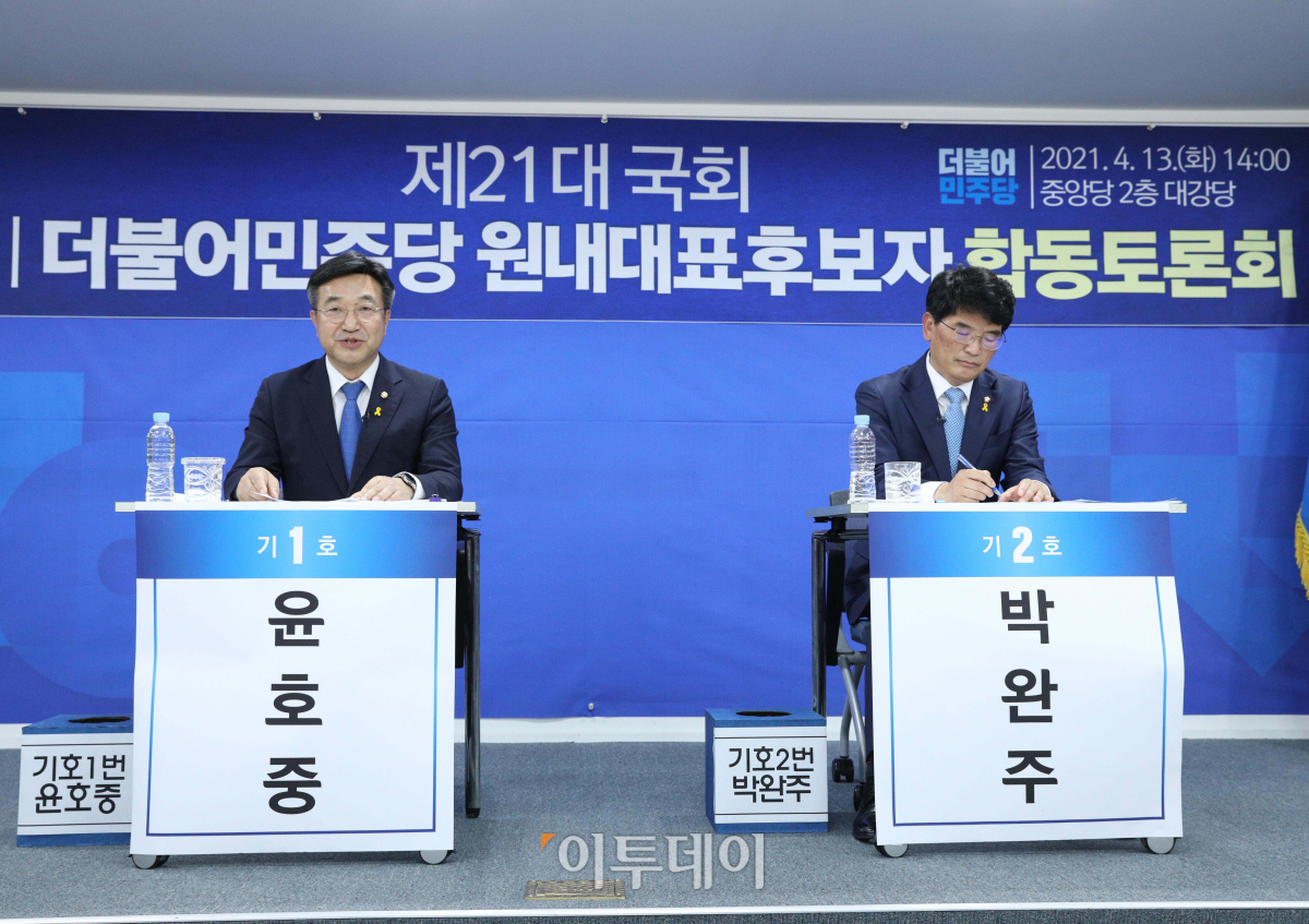 윤호중(왼쪽), 박완주 더불어민주당 원내대표 후보자가 13일 오후 서울 여의도 더불어민주당사에서 열린 원내대표 후보자 합동토론회에서 기조연설을 하고 있다.