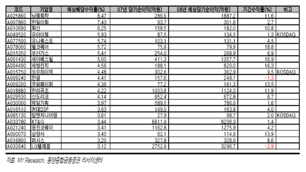 동양종금증권은 이들 조건을 충족하는 기업 22개 가운데 ▲남해화학 ▲한일이화 ▲화신 ▲유아이엘 ▲유니퀘스트 ▲텔코웨어 ▲부산가스 순으로 예상배당수익률이 높을 것으로 예상했다.