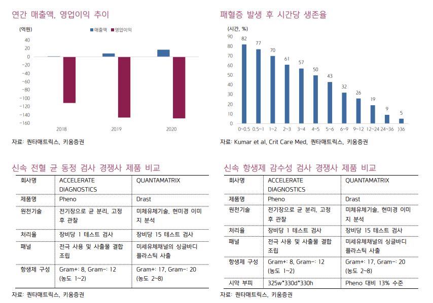 박재일 키움증권 연구원은 “패혈증은 발병 후 시간의 경과에 따라 사망률이 급격하게 증가하며 이에 신속한 진단을 통한 정확한 처방이 매우 중요하다”면서 “퀀타매트릭스의 dRAST 솔루션은 기존 항생제 감수성 검사(60시간) 대비 2일 빠른 결과를 제공하며 장비당 15 테스트 검사가 가능해 기존 제품 대비 처리율 우위에 있다”고 설명했다.