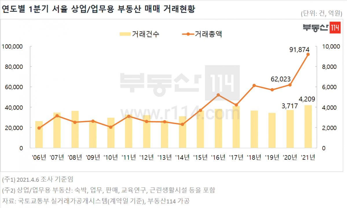 부동산 정보업체 부동산114에 따르면 올 1분기 서울에서 신고된 수익형 부동산 매매 계약은 4209건이다. 부동산 실거래 신고제가 시행된 이래 1분기 기준 가장 많은 거래다. 거래액도 9조1874억 원으로 1분기 기준 최다치를 기록했다. 지난해(6조2023억 원)와 비교해도 3조 원 가까이 늘었다.