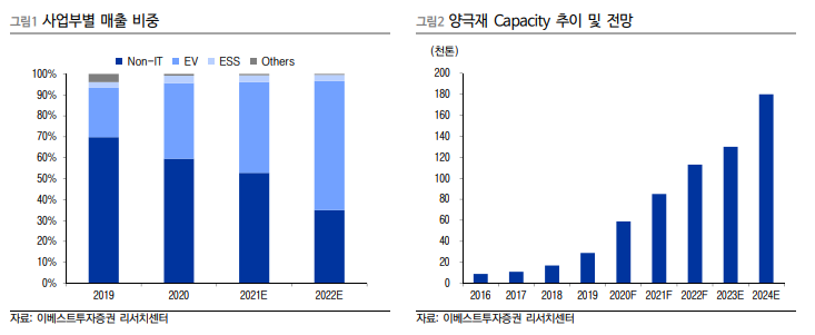 이 연구원은 "SK이노베이션과 LG에너지솔루션의 소송이 합의로 마무리되면서 SK이노베이션 공급 물량에 대한 불확실성이 해소됐다"며 "이에 지난해 성장을 이끌어왔던 SK이노베이션향 NCM811 공급 지속과 더불어 CAM5 2라인 2021년 하반기, CAM5N 2022년 하반기 양산이 계획대로 진행될 것"이라고 전망했다.