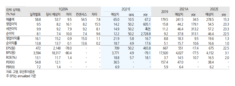 박종선 유진투자증권 연구원은 "1분기 잠정실적(연결기준)은 매출액 588억 원, 영업이익 95억 원을 달성하면서 전년동기대비 각각 15.8%, 61.3% 증가했다"며 "이는 시장 기대치(매출액 545억원, 영업이익 82억 원) 대비 매출액과 영업이익이 각각 7.8%, 15.5% 증가하며 소폭 상회한 수준"이라고 설명했다.