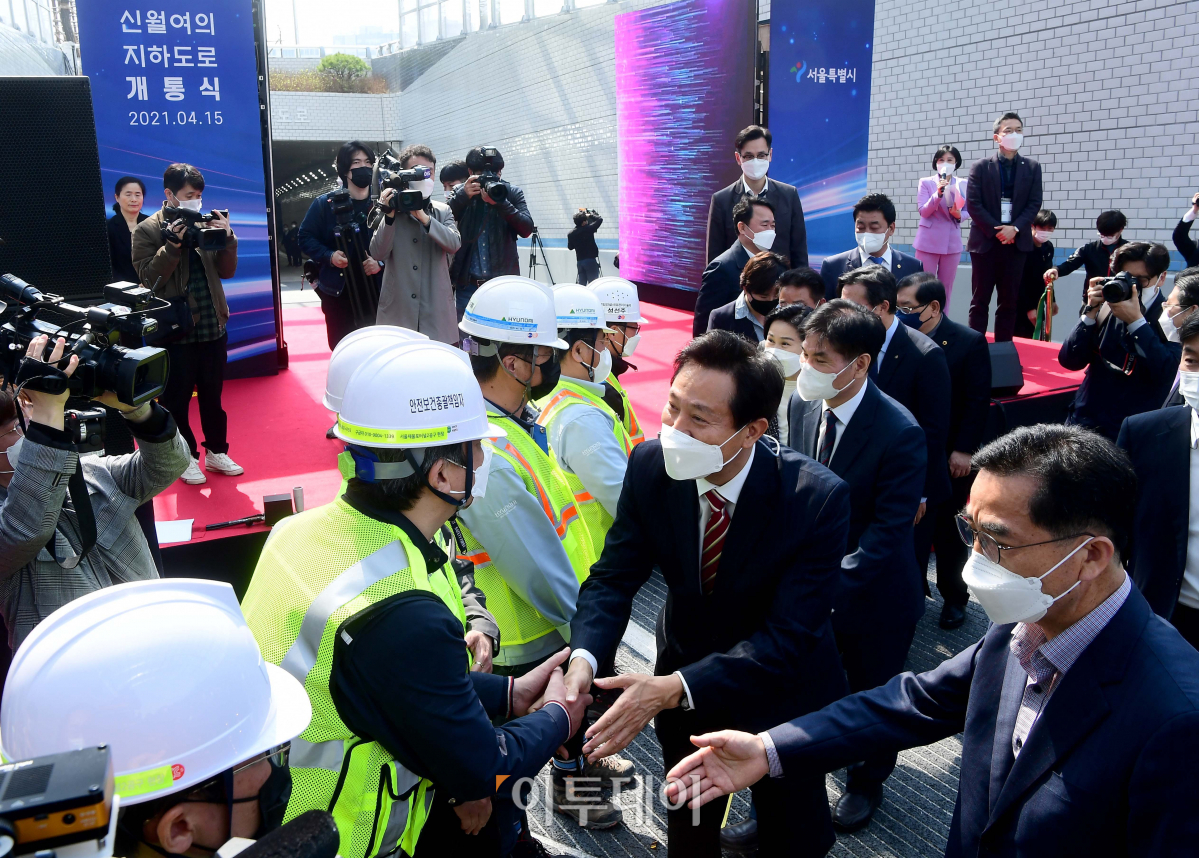15일 서울 여의도 신월여의지하도로 입구에서 열린 개통식에서 오세훈 서울시장이 공사 관계자들을 격려하고 있다. 16일 0시에 개통되는 신월여의지하도로는 서울 서남권(신월IC)과 도심(여의대로, 올림픽대로)을 직접 연결하는 왕복 4차로, 총 연장 7.53km의 대심도 지하터널로, 국회대로 하부 지하 50~70m에 들어섰다. 지난 2015년 10월 첫 삽을 뜬지 5년 6개월만에 완공됐다.