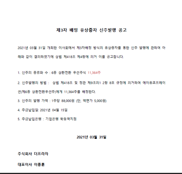 더프라자는 같은 해 11월 6일 1주당 8만8000원에 인라이트9호 넥스트유니콘 벤처 펀드를 대상으로 1만1364주를 3자 배정 방식으로 증자(약 10억 원)했다.