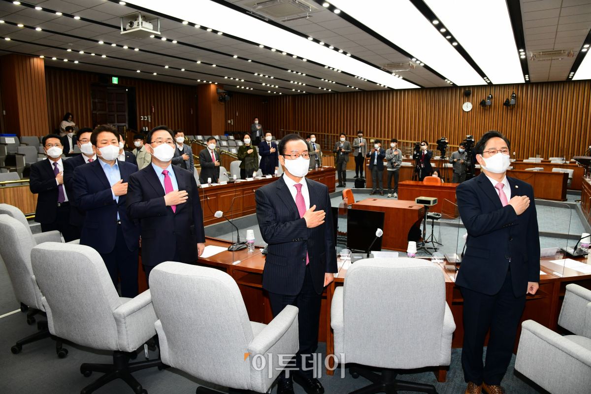 주호영 국민의힘 대표 권한대행을 비롯한 참석자들이 19일 오전 서울 여의도 국회에서 열린 시·도당위원장 회의에서 국민의례를 하고 있다.