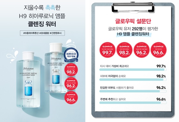 JM솔루션(제이엠솔루션)의 H9 클렌징 워터가 자극 없이 잘 지워지는 클렌징 제품으로 글로우픽 설문단의 호평을 받았다.