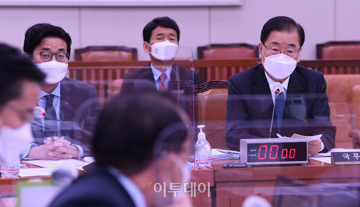 정의용 외교부장관이 20일 서울 여의도 국회에서 열린 외교통일위원회 전체회의에서 국민의힘 조태용 의원의 일본정부 후쿠시마 원전 오염수 방류와 관련한 질문에 답하고 있다.