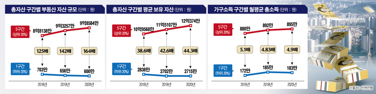 20일 신한은행이 전국 경제활동자 1만 명을 대상으로 조사한 ’2021 보통사람 금융생활 보고서‘에 따르면 5구간의 부동산 자산 규모는 매년 증가했다. 2018년 8억8138만 원, 2019년 9억3257만 원, 2020년 9억8584만 원으로 꾸준히 늘었다. 반면 1구간은 2018년 703만 원, 2019년 656만 원, 2020년 600만 원으로 줄며 두 구간 간 격차는 125배(2018년)에서 164배(2020년)로 확대됐다.