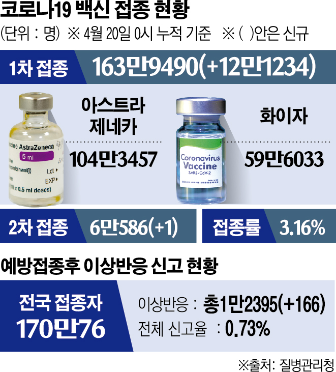 20일 코로나19 예방접종대응추진단에 따르면 지난 2월 26일 국내에서 코로나19 백신 접종이 시작된 이후 이상반응 의심 신고는 이날까지 누적 1만2395건이다. 0시 기준 국내 1·2차 누적 접종 170만76건의 0.73% 정도다.