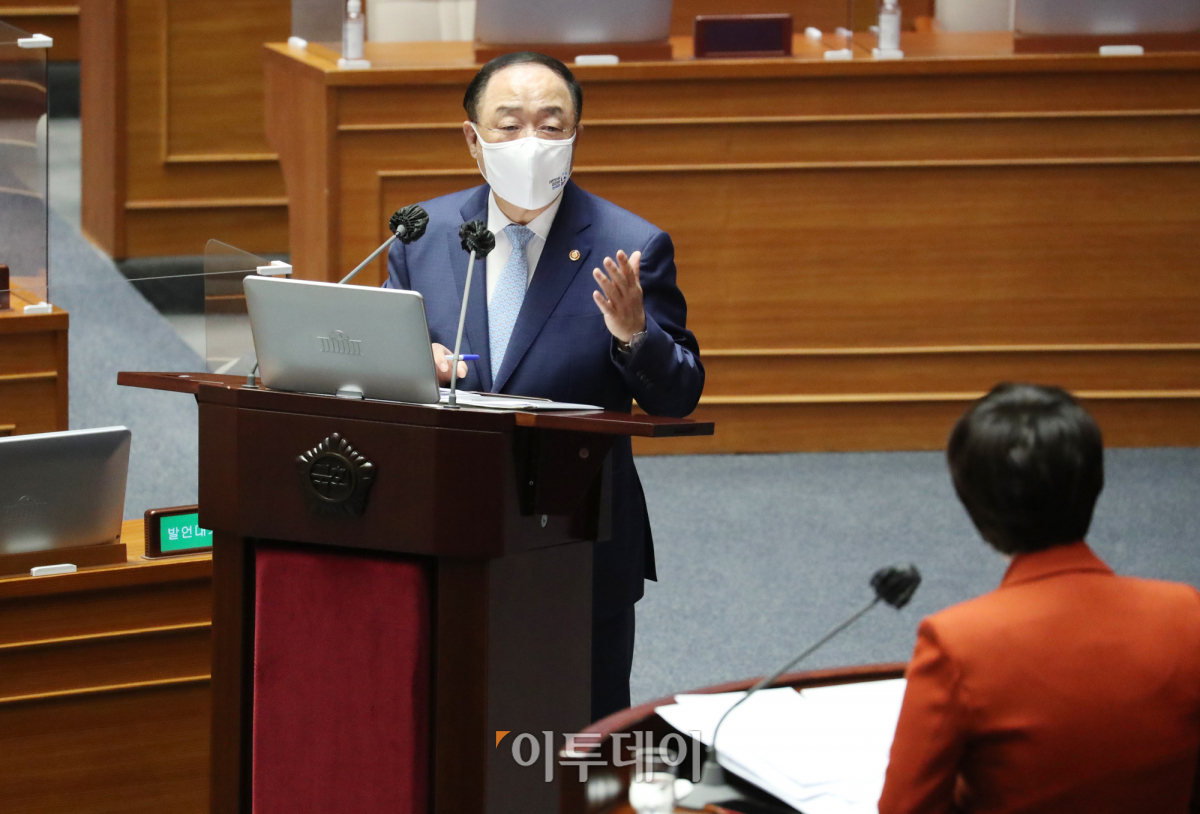홍남기 국무총리 직무대행이 20일 오후 국회 본회의에서 열린 경제분야 대정부 질문에서 국민의힘 김은혜 의원으로부터 향후 코로나19 백신 확보 여부 등에 대한 질문에 답하고 있다.