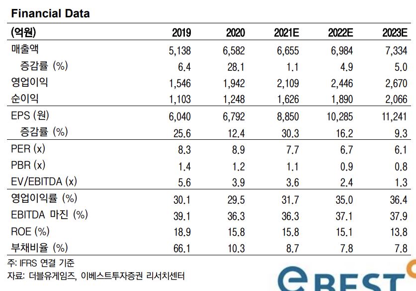 이베스트투자증권은 21일 더블유게임즈에 대한 ‘매수’ 의견을 유지하고, 목표가를 9만 원으로 상향한다고 밝혔다. 한국 더블다운인터액티브(DDI) 나스닥 상장 재추진이 주가 모멘텀이 될 것으로 판단했다.