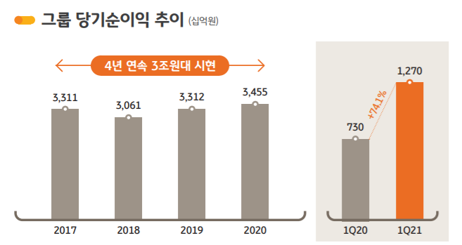 1분기 순이자이익은 2조6423억 원으로 전년 동기 대비 12.5% 늘었다. 푸르덴셜생명 인수와 견조한 여신성장에 힘입은 영향이다. 같은 기간 순수수료이익은 9672억 원으로 44.3% 증가했다. 이는 주식시장 호황으로 중권업 수입수수료가 크게 증가하고, 은행의 신탁이익이 개선됐기 때문이다.