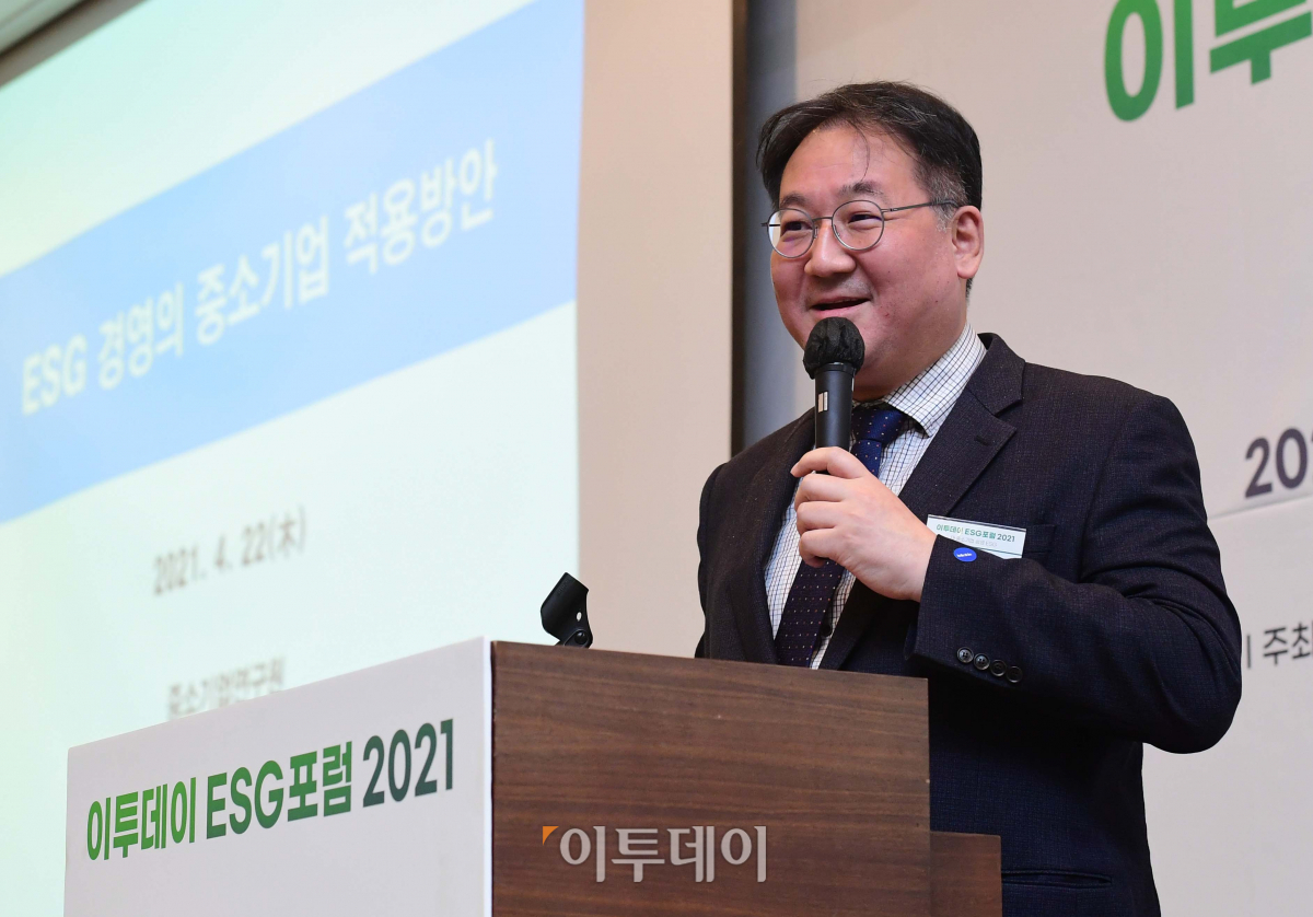 22일 서울 여의도 전경련회관에서 열린 ‘이투데이 ESG포럼 2021’에서 노민선 중소기업연구원 미래전략연구단장이 ‘ESG경영의 중소기업 적용방안’을 주제로 발표하고 있다. ESG는 기업의 비재무적 요소인 환경(Environment)·사회(Social)·지배구조(Governance)를 뜻하는 말이다. 이투데이가 ‘대·중소기업 상생 ESG’를 주제로 마련한 이날 행사엔 대기업과 중견·중소기업, 중소상공인이 참석, ESG경영의 의미를 이해하기 쉽게 정리하고 ESG경영을 위한 준비를 함께 논의했다.