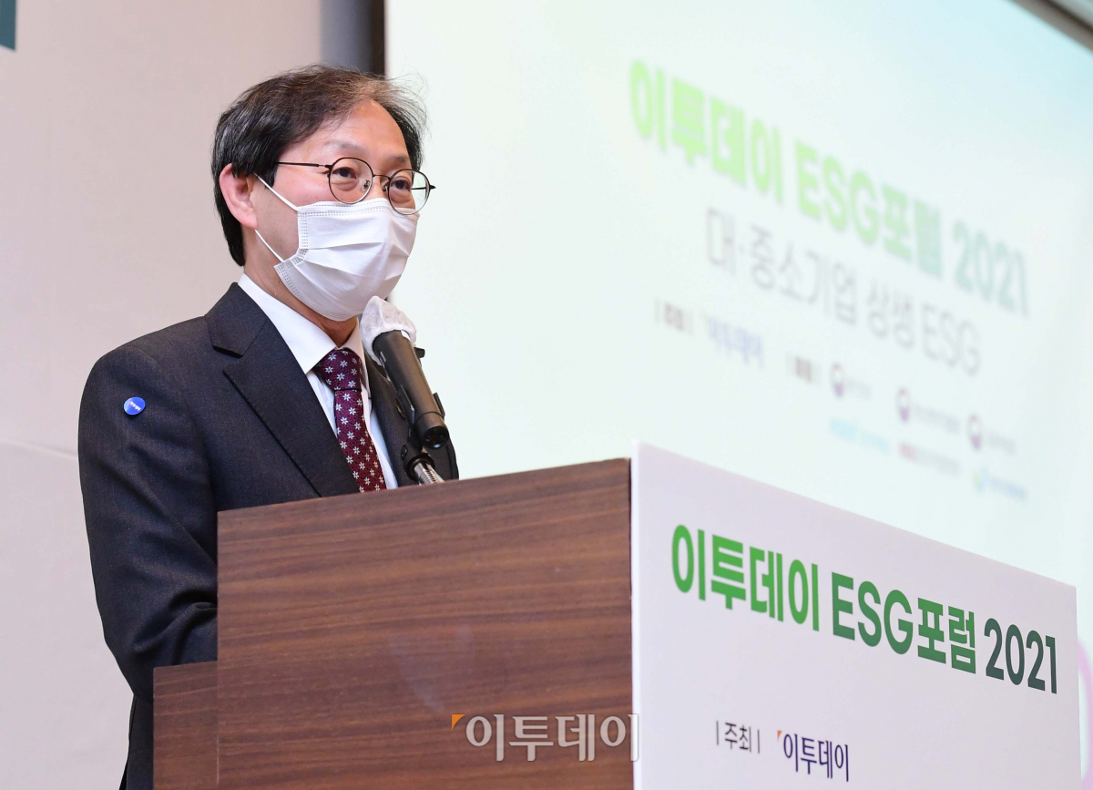 22일 서울 여의도 전경련회관에서 열린 ‘이투데이 ESG포럼 2021’에서 김성주 더불어민주당 의원이 축사를 하고 있다. ESG는 기업의 비재무적 요소인 환경(Environment)·사회(Social)·지배구조(Governance)를 뜻하는 말이다. 이투데이가 ‘대·중소기업 상생 ESG’를 주제로 마련한 이날 행사엔 대기업과 중견·중소기업, 중소상공인이 참석, ESG경영의 의미를 이해하기 쉽게 정리하고 ESG경영을 위한 준비를 함께 논의했다.