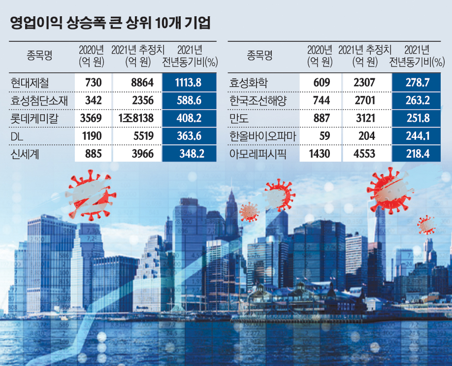 철강, 건설 등 경기민감업종의 실적도 크게 늘어날 전망이다. 현대제철과 포스코의 영업이익은 전년보다 각각 1113.8%, 111.7% 늘어날 것으로 보이고, DL은 363.5% 증가할 것으로 업계는 분석했다. 코로나19로 멈췄던 건설현장이 다시 활성화되면서 전 세계적으로 철강 수요가 늘어나고, 가격 협상에 우위를 가지게 된 것이다. 이미 포스코의 1분기 영업이익은 1조5520억 원으로 2011년 2분기 영업이익 다음으로 높은 성적을 기록했다.