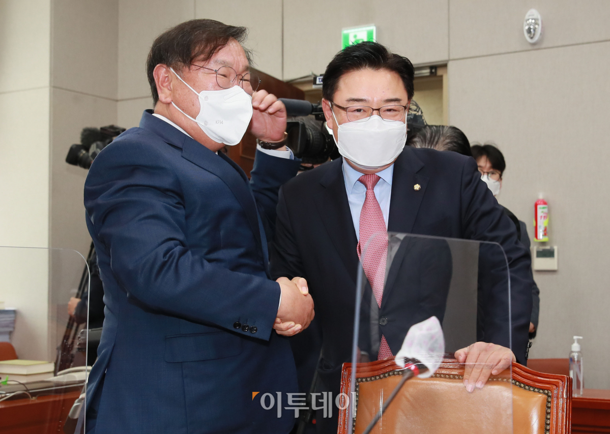 김태년(왼쪽) 국회 운영위원장과 김성원 국민의힘 의원이 27일 오후 서울 여의도 국회에서 열린 운영위원회 전체회의 산회 후 악수를 나누고 있다.