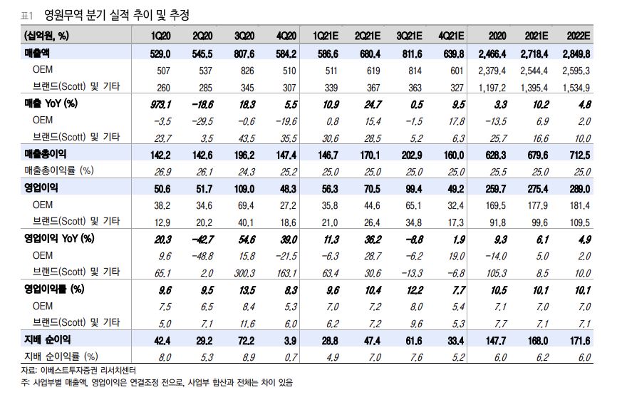 심지현 이베스트투자증권 연구원은 “영원무역의 1분기 영업이익은 전년 대비 11.3% 증가한 563억 원으로 예상한다”면서 “2021년은 글로벌 경기 정상화 기대감에 힘입어 소비가 증가할 기업에 무엇보다 주목도가 쏠리고 있다”고 판단했다.