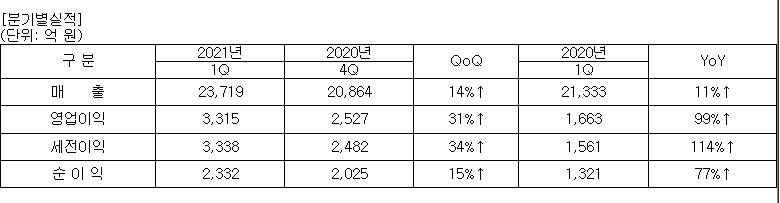 전년 동기 대비 매출은 11%, 영업이익은 99% 증가했다. 전 분기와 비교하면 매출은 14%, 영업이익은 31% 증가했다.