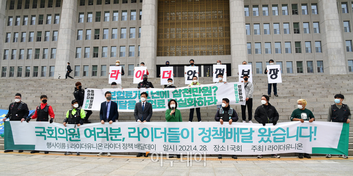 28일 오후 국회 본청 앞에서 열린 '라이더유니온 라이더 정책 배달데이'행사에서 심상정 정의당 의원이 발언을 하고 있다. 이날 배달노동자 노조인 라이더유니온 회원들은 심상정 정의당 의원과 국회 환노위 소속 김웅 국민의힘 의원, 장철민, 이수진 더불어민주당 의원에게 라이더들의 정책(안전배달료 도입, 배달용보험료 현실화, 쿠팡배민 갑질 규제, 배달사업체 등록제 실시, 배달앱 알고리즘 규제)이 담긴 피자박스를 전달하는 퍼포먼스를 펼쳤다.