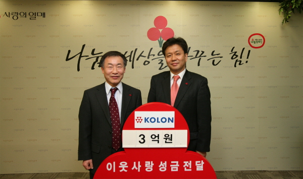코오롱그룹은 31일 어려운 경제상황에 고통을 더 받을 수 밖에 없는 소외 이웃들에게 작은 희망이 되길 바라는 마음을 담아 사회복지공동모금회에 3억원의 성금을 전달했다.
