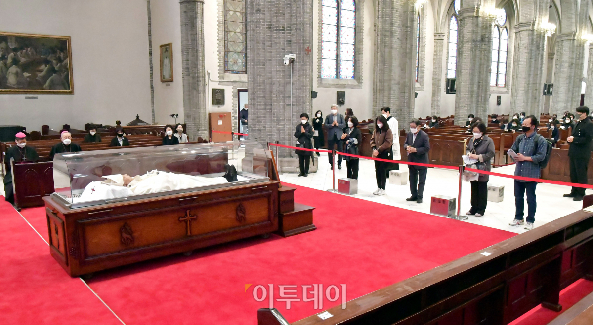 30일 서울 중구 명동성당에 마련된 고(故) 정진석 추기경의 빈소를 찾은 조문객들이 조문하고 있다. 사진공동취재단