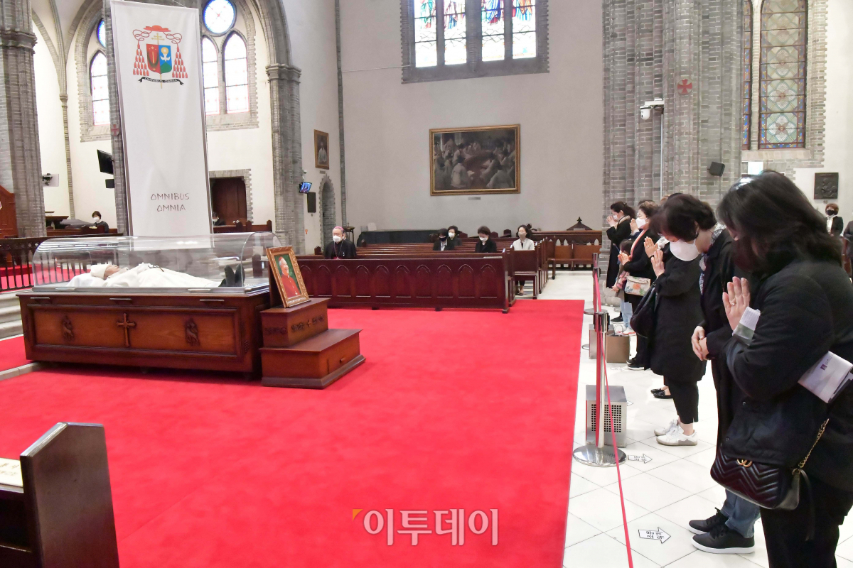 30일 서울 중구 명동성당에 마련된 고(故) 정진석 추기경의 빈소를 찾은 조문객들이 조문하고 있다. 사진공동취재단
