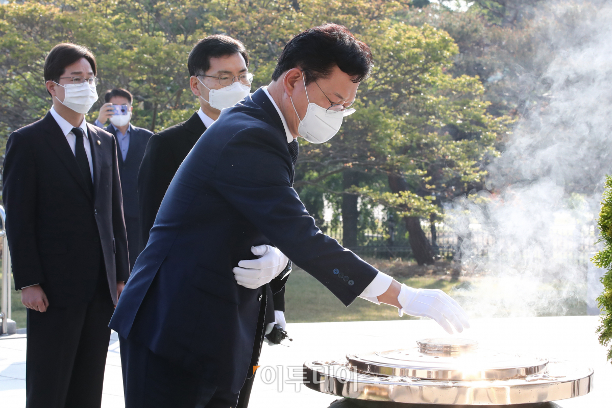 더불어민주당 송영길 신임 당대표와 윤호중 원내대표, 최고위원들이 3일 오전 서울 동작구 현충원을 방문해 현충탑에서 참배하고 있다. 국회사진취재단