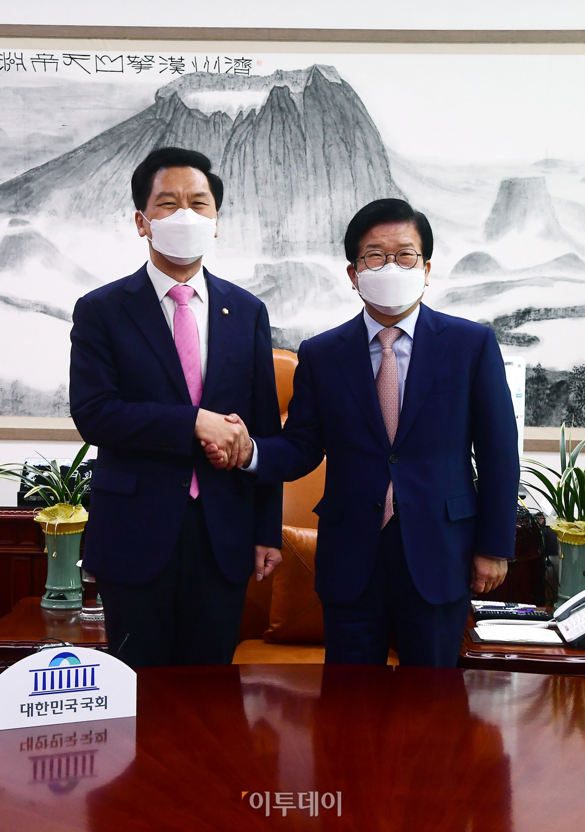 박병석(오른쪽) 국회의장이 3일 서울 여의도 국회 의장실에서 김기현 신임 국민의힘 당대표 권한대행 겸 원내대표의 예방을 받고 있다.