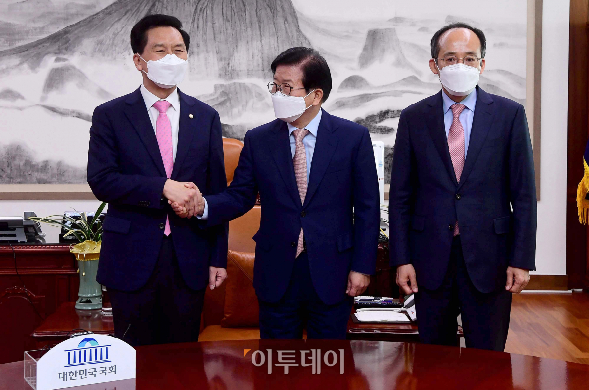 박병석(가운데) 국회의장이 3일 서울 여의도 국회 의장실에서 김기현(왼쪽) 신임 국민의힘 당대표 권한대행 겸 원내대표의 예방을 받고 있다. 오른쪽은 추경호 신임 국민의힘 원내수석부대표.