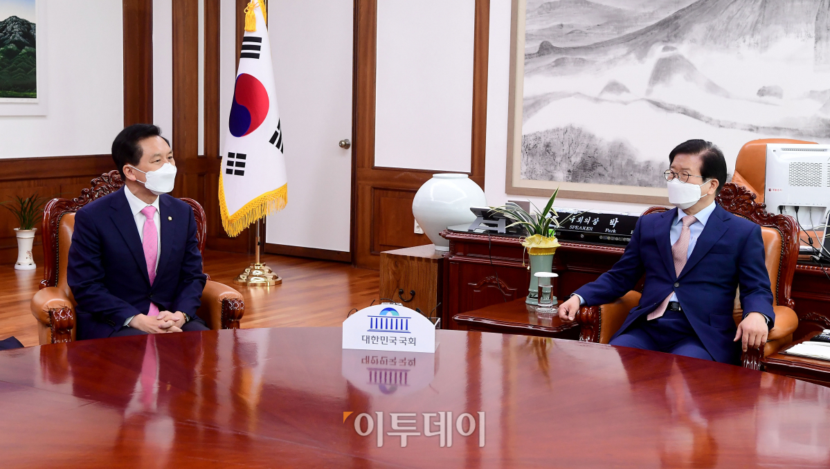 박병석(오른쪽) 국회의장이 3일 서울 여의도 국회 의장실에서 김기현 신임 국민의힘 당대표 권한대행 겸 원내대표의 예방을 받고 있다.