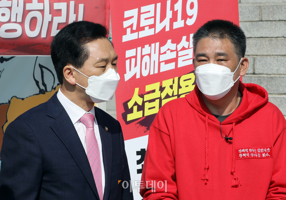 김기현 국민의힘 원내대표 겸 당대표 권한대행이 3일 오전 서울 여의도 국회 본청 앞 코로나19에 따른 소상공인의 손실보상 소급적용 입법 촉구 천막농성장을 방문해 최승재 국민의힘 의원과 대화를 나누고 있다.
