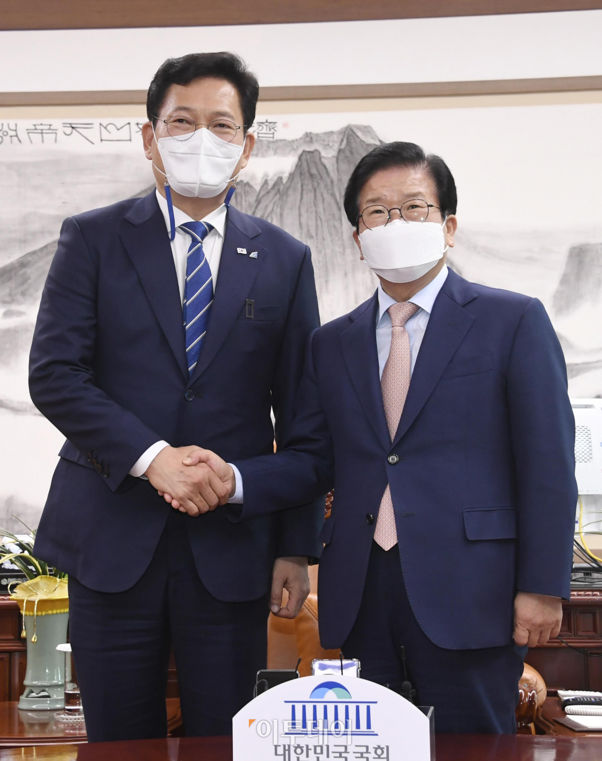 [포토] 악수하는 박병석 의장-송영길 민주당 대표