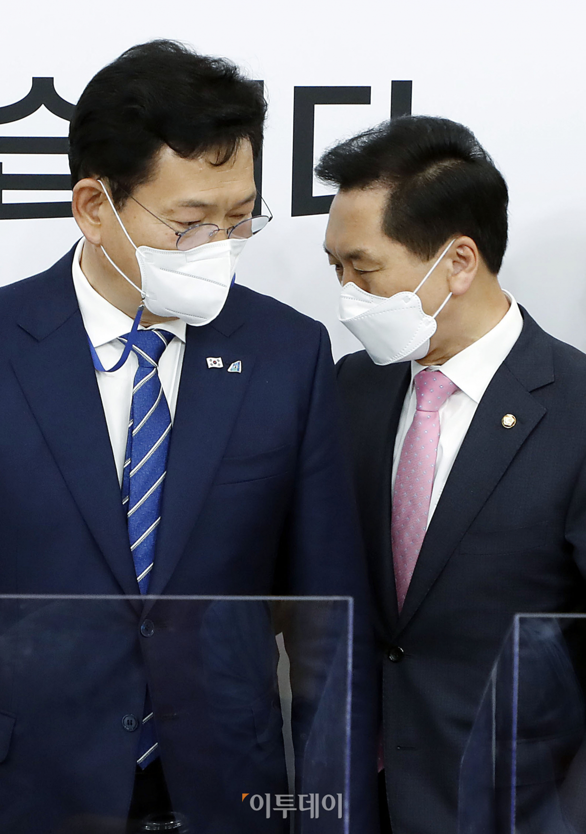 더불어민주당 송영길 신임 대표가 3일 서울 여의도 국회에서 국민의힘 김기현 대표 권한대행 겸 원내대표를 예방해 기념촬영 준비를 하고 있다.