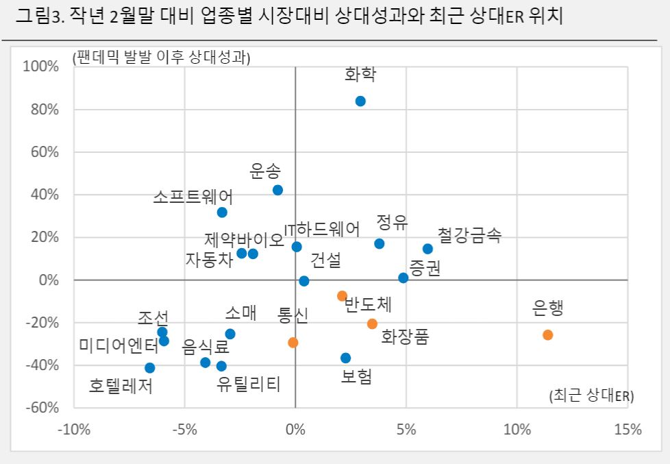 이어 "최근 상대ER 변화에서 확인한 이익모멘텀 양호한 업종들은 두드러진 상승을 보인다는 점에서 주가 레벨을 고려한 접근이 유효할 것"이라고 판단했다.