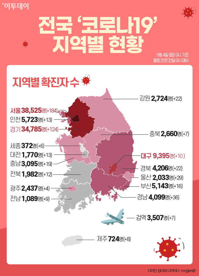질병관리청 중앙방역대책본부에 따르면 5월 4일 0시 기준, 전일 0시 대비 541명이 추가 확진 판정을 받아 전국 확진자 수는 12만4269명으로 늘었다.