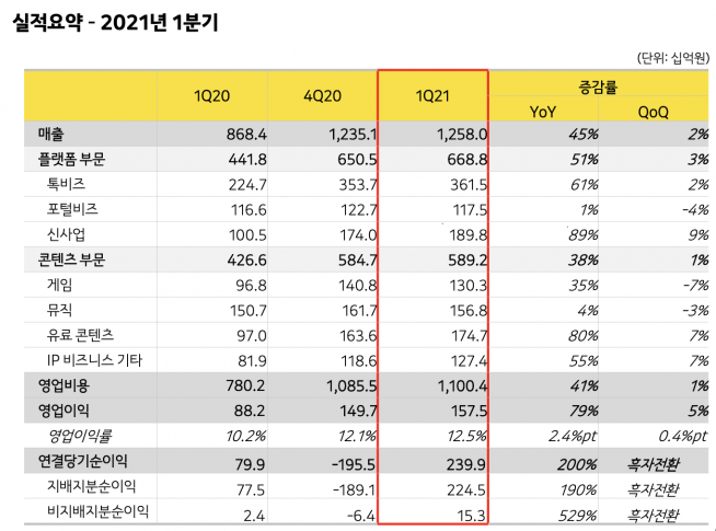 카카오의 1분기 플랫폼 부문 매출은 전 분기 대비 3%, 전년 동기 대비 51% 증가한 6688억원으로 집계됐다.