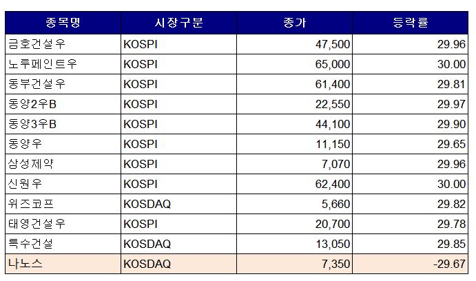 7일 국내 증시(코스피ㆍ코스닥)에서는 11개 종목이 상한가, 1개 종목이 하한가를 기록했다.
