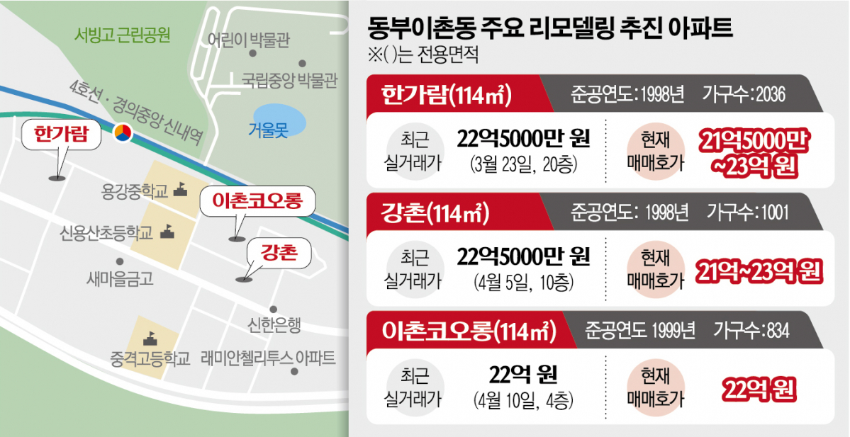 이촌코오롱과 한가람 등 주요 단지들의 리모델링 조합 설립이 가속화되면서 아파트값도 상승세를 타고 있다. 국토교통부 실거래가에 따르면 이촌코오롱 전용면적 114㎡형은 지난달 10일 22억 원(4층)에 신고가 거래됐다. 이전 최고가는 지난 1월 거래된 20억 원(13층)이었다. 강촌아파트 역시 같은 평형이 지난달 5일 직전 최고가보다 6000만 원 오른 22억5000만 원(10층)에 손바뀜됐다. 한가람아파트도 전용 114㎡형이 지난 3월 최고가인 22억5000만 원(20층)에 거래됐다.
