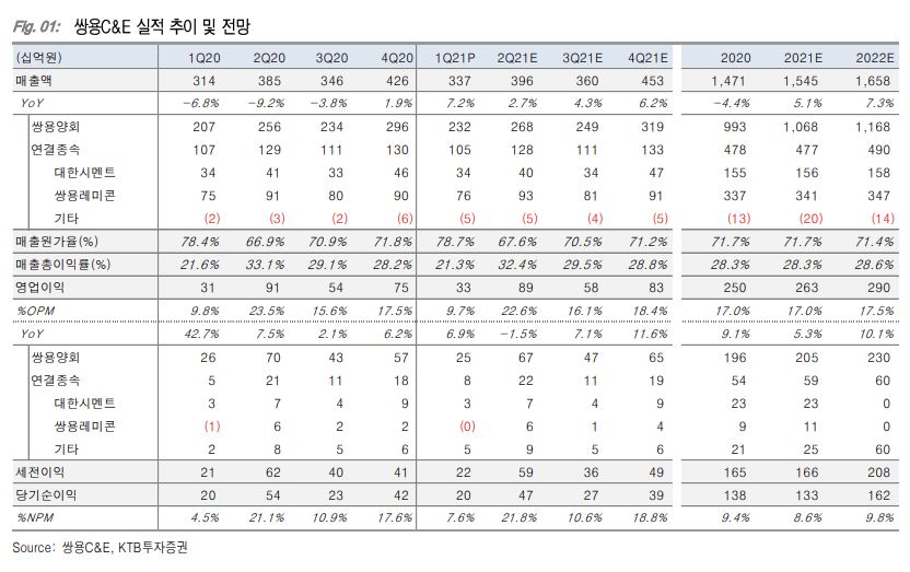 라진성 KTB투자증권 연구원은 “시멘트 가격 상승, 시멘트 출하량 증가, 순환자원처리시설 가동 본격화에 따른 비용 감소 등의 요인으로 매출과 이익 개선이 예상된다”면서 “친환경 패러다임 전환과 양호한 배당수익률(5.8%)을 감안하면 높은 투자매력도 보유하고 있다”고 설명했다.