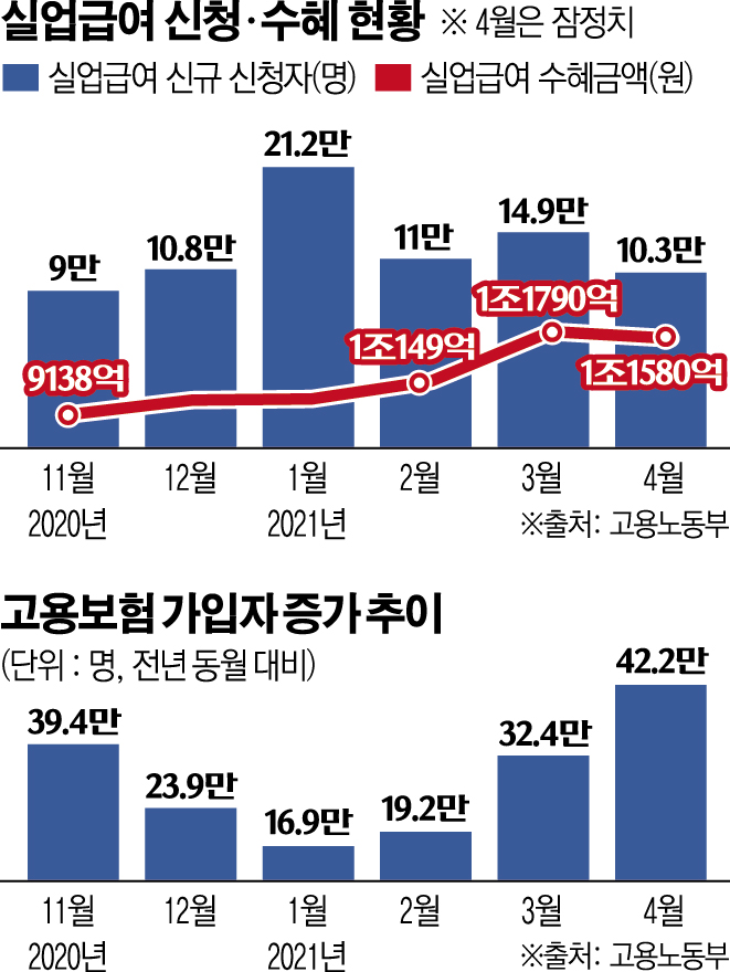 고용노동부가 10일 발표한 4월 노동시장 동향 통계에 따르면 지난달 고용보험 가입자 수는 1419만7000명으로 전년 대비 42만2000명(3.1%) 증가했다. 이는 코로나19 사태에 따른 고용 충격이 본격화하기 전인 작년 2월 증가 폭(37만6000명)을 웃도는 수치다.